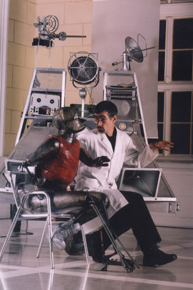 Gre za prezentacijo mojega življenskega dela. Uspelo mi je priti v kontakt s Plastosi, ki so bili odkriti leta 2223 v arheološkem najdišču Katastropolis. Tipične Plastose prepoznamo po kombinaciji človeških organov z organskimi deli drugih živih bitij in pogosto tudi po kombinaciji organskih in mehanskih delov. Ob navzočnosti človeka se sicer ne premikajo, rekli bi lahko, da otrpnejo, zato se nam morda zdi, da so mrtvi muzejski eksponati. Zato je postavitev moj izjemen znanstveno-komunikacijski dosežek, saj sem po mnogih letih trdega dela prodrl v komunikacijski svet Plastosov. Še več. Uspelo mi je celo navezati tesne stike s predstavnikom Plastosov Kastorjem Meškom. Priče tega dogodka so potrdile, da sva se zapletla v dolg in prisrčen pogovor, v katerem mi je Meško razkril delovanje Energotrona (na fotografiji v ozadju), ki ga skrivnostna civilizacija uporablja pri komuniciranju in časovno prostorskih potovanjih. S tem dejanjem je odkrita še ena neznanka v zgodovini človeštva. Nepojasnjeno pa ostaja spolno življenje Plastosov, vendar obljubljam, da bom raziskal tudi to. (Plastosolog Jevgenij Skavčenko a.k.a. akademski kipar Marko A. Kovačič,